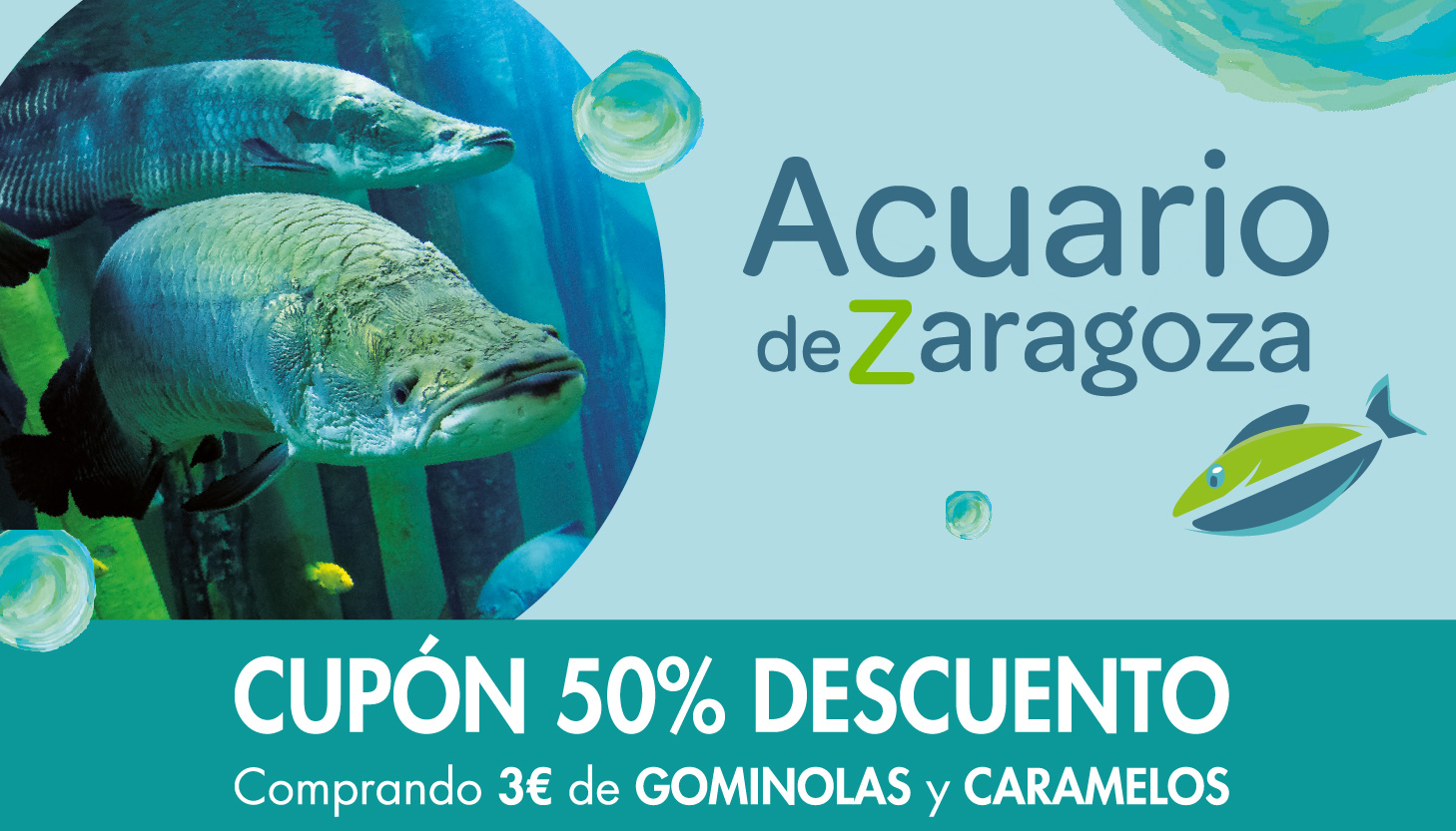 En todas nuestras tiendas, por compras superiores a 3€ en caramelos y gominolas, podrás disfrutar de… ¡un cupón descuento* del 50% en tu entrada para el Acuario de Zaragoza!