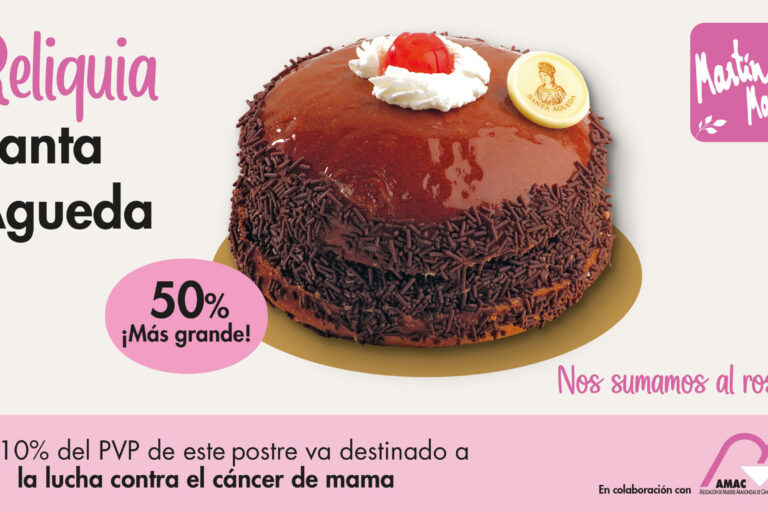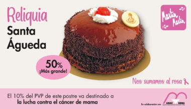 Se acerca la festividad de Santa Águeda y un año más, nuestra reliquia rellena de nata y trufa va a ir acompañada de una cajita rosa. El motivo del cambio de color en la caja de este postre, es porque como en años anteriores, el 10% del PVP de la reliquia irá distinado a AMAC…