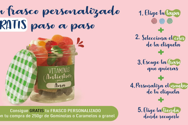 Tu frasco de gominolas gratuito personalizado paso a paso! Es muy fácil, con la compra de 250gr de gominolas y caramelos a granel consigue tu frasco personalizado totalmente gratis siguiendo estos sencillos pasos, Rellena la encuesta con tus datos de contacto Elige la tapa que más te guste Selecciona el color de la pegatina que…