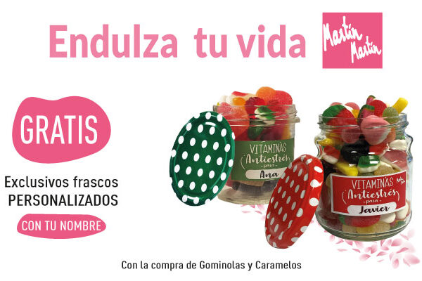 En Martín Martín inauguramos el mes de octubre endulzando vuestros días. Este mes nuestra sección de caramelos y gominolas es la protagonista y con su compra podrás obtener exclusivos frascos a los que podrás añadir una etiqueta personalizada para ti o para quien quieras sorprender. ¿Cómo conseguir tu frasco GRATIS? Con la compra…