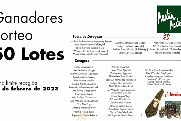 Durante el mes de diciembre hemos ido recogiendo vuestras participaciones para el sorteo 50 lotes de productos Martín Martín. Estos han sido los afortunados: Zaragoza: Esther Soria Marco (Calle Alfonso) Mar Salvador Monge (Avenida Madrid) Josefina Clemente Cadarroso (Avenida América) Inma Fernández Moret (Bruselas) Pilar Muñoz Machin (Calanda) Susana Martínez Monje (Cesáreo Alierta) Rosa…
