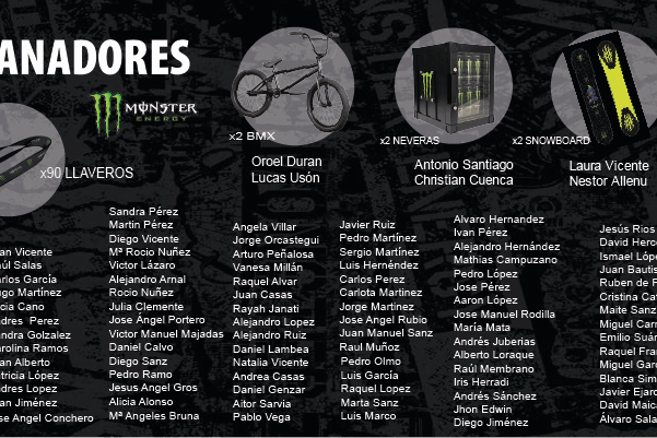 Ya tenemos los ganadores del Sorteo de Monster que hemos tenido en nuestras tiendas. Entre todos los participantes, estos son los afortunados que podrán disfrutar del premio ¡Enhorabuena a todos! y gracias a todos los participantes.