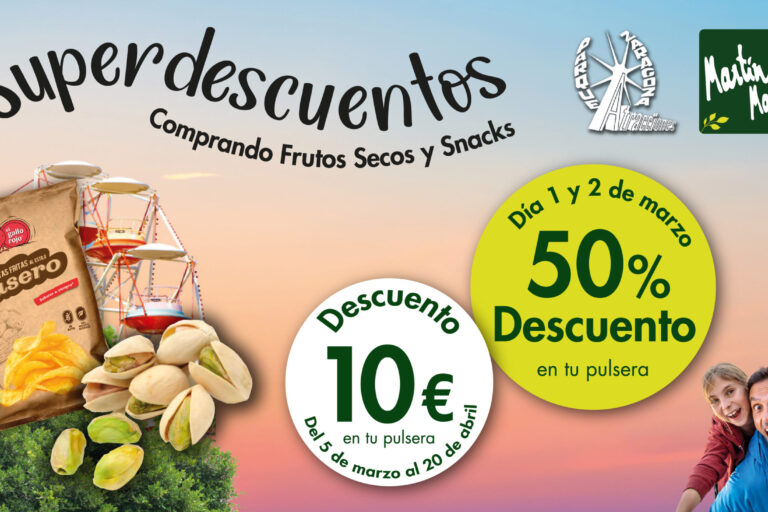 Disfruta de tus frutos secos y snacks favoritos con Superdescuentos para el Parque de Atracciones Durante este mes, comprando 3€ en FRUTOS SECOS Y SNACKS en nuestras tiendas Martín Martín, te regalaremos SUPERDESCUENTOS para El Parque de Atracciones de Zaragoza del 50% (días 1 y 2 de marzo) y de 10€ de descuento (del 5…